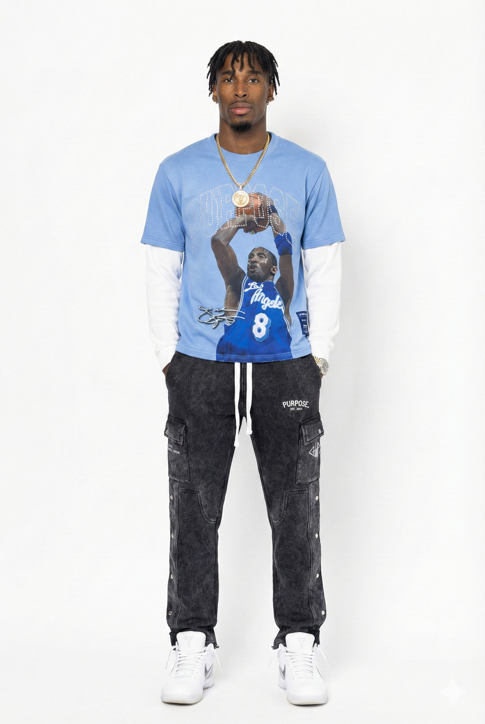 The front features an iconic game-time moment layered beneath a rhinestone “PURPOSE” graphic — symbolizing that true greatness is built through dedication and intention. A signature-style detail and LWP authenticity patch ground the piece in our mission.