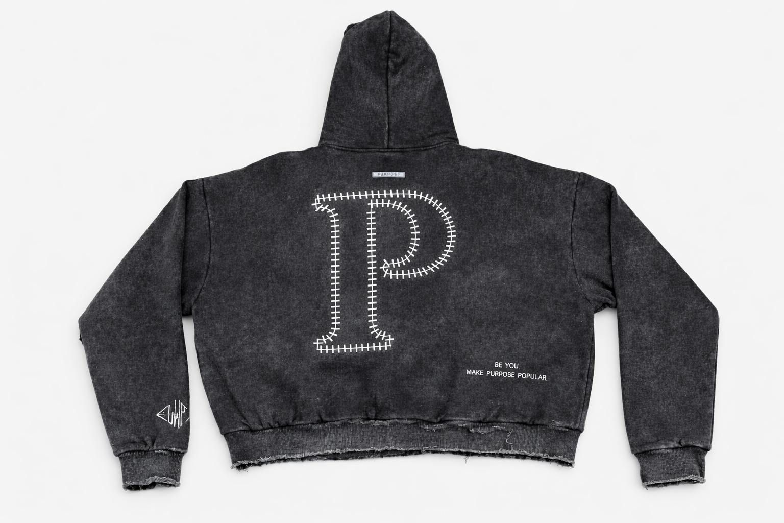 The back features our oversized stitched “P” graphic, symbolizing that purpose is built through pressure, patience, and process — every stitch representing the journey. The front brings a tactical edge with multi-zip utility detailing, creating structure, dimension, and presence in every fit.